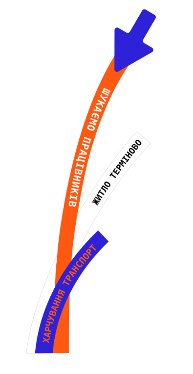 Спершу увагу привертають вертикальні конструкції (2шт), що містять тексти-обіцянки роботи, доходу та гасло проєкту – люди бачать їх і підходять, щоб роздивитися, куди вказують оголошення та банер-ролап з описом акції (1 шт).