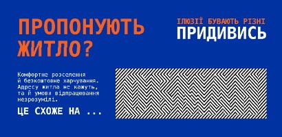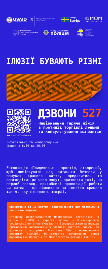 Експозиція “ПРИДИВИСЬ” – це простір, створений, щоб поміркувати над ризиками експлуатації, придивитись й розгледіти: до чого можуть призвести такі, на перший погляд, привабливі пропозиції роботи чи житла – що приховано за ілюзією кращого життя.